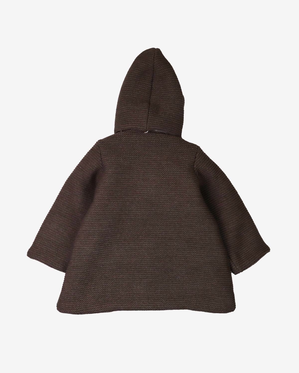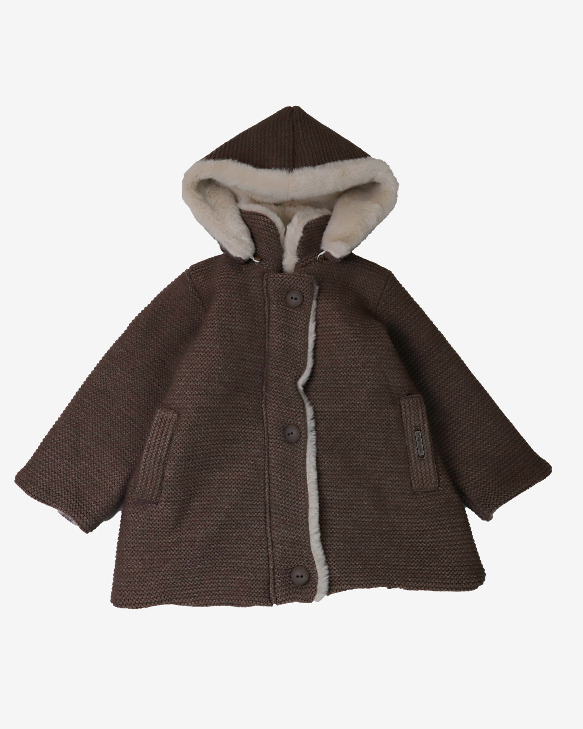 Abrigo de manga larga en color marrón, con capucha desmontable y dos bolsillos laterales. Abertura central delantera con cremallera y una tapeta superior con cierre de tres botones a presión. Confeccionado en tejido 100% de algodón, con interior de pelo, suave y gustoso. Para peques de 6 meses a 8 años.