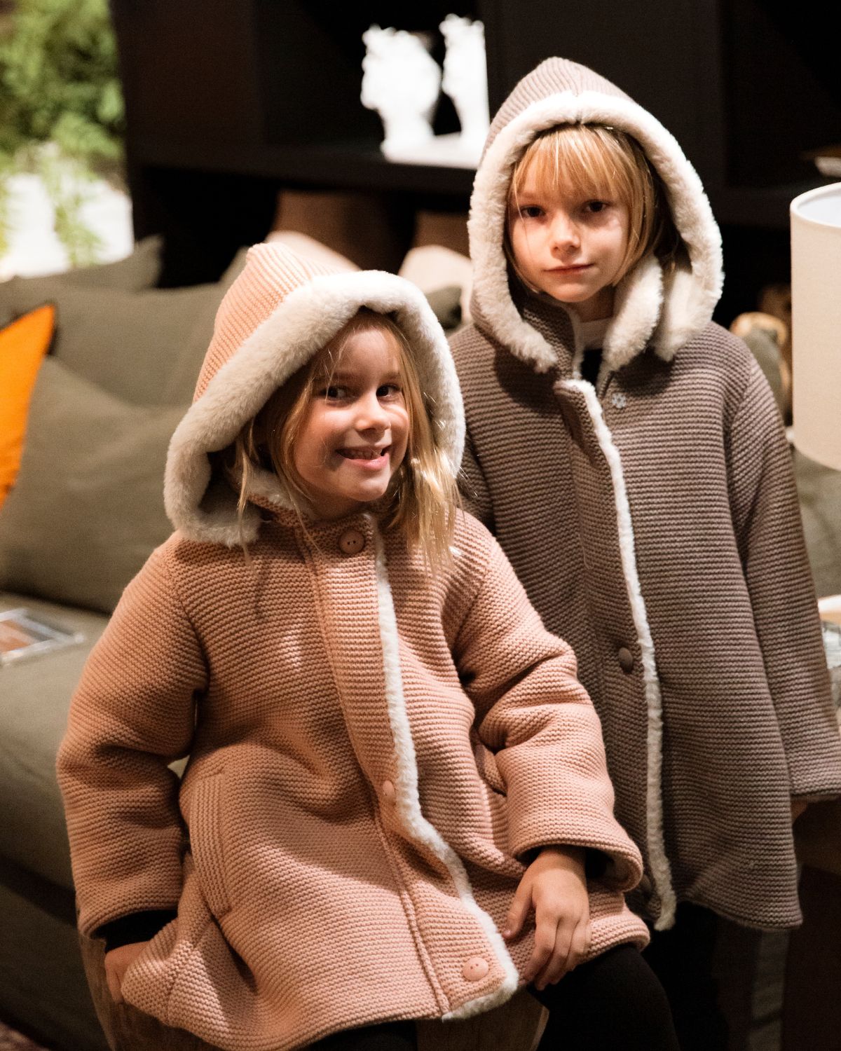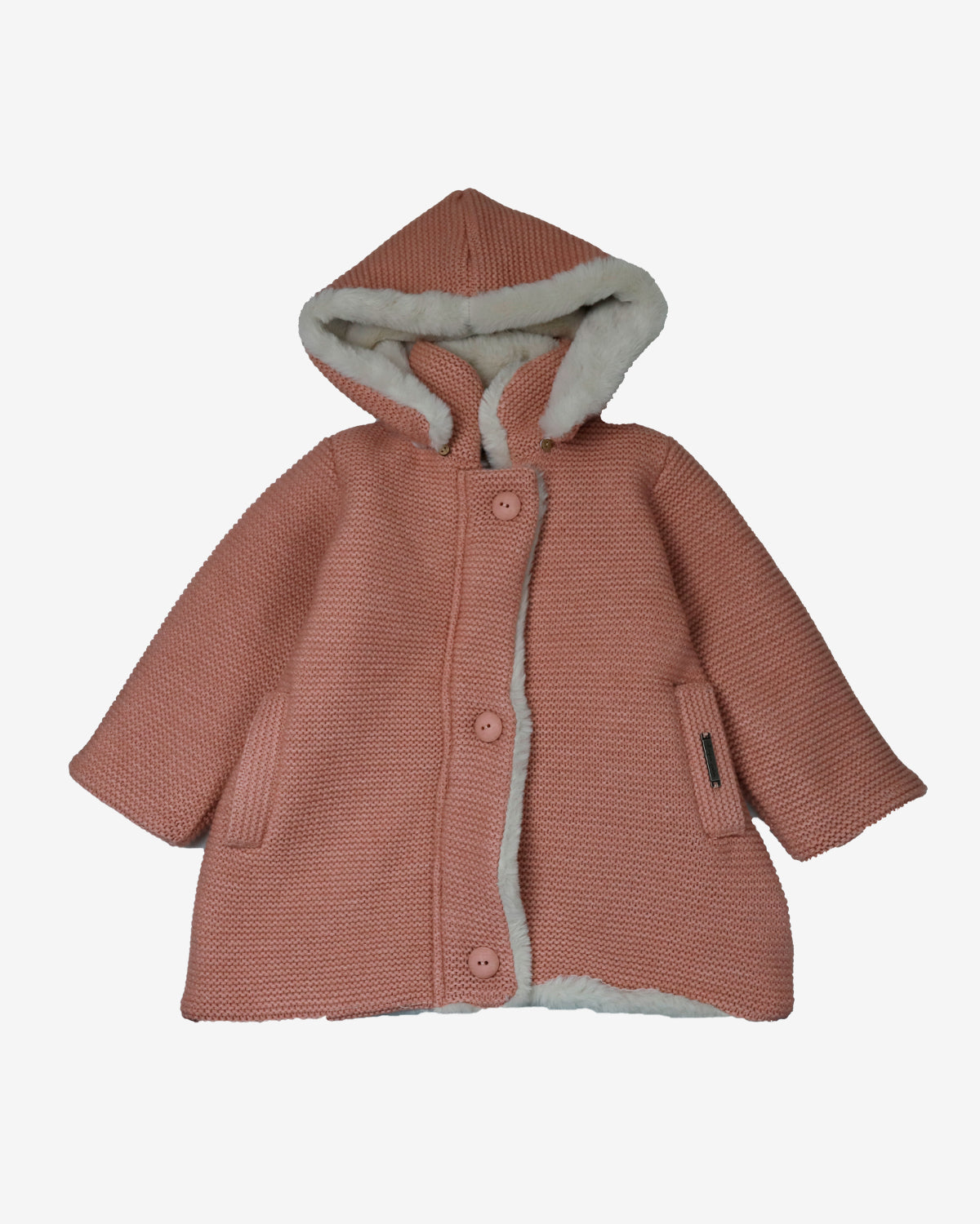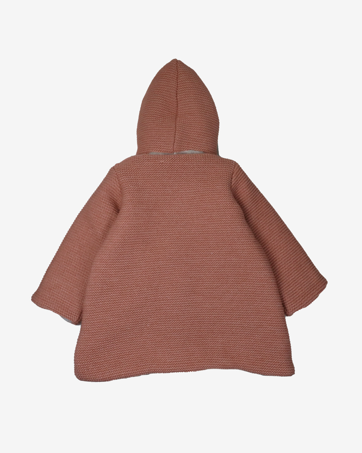 Abrigo de manga larga en color palo, con capucha desmontable y dos bolsillos laterales. Abertura central delantera con cremallera y una tapeta superior con cierre de tres botones a presión. Confeccionado en tejido 100% de algodón, con interior de pelo, suave y gustoso. Para peques de 6 meses a 8 años.