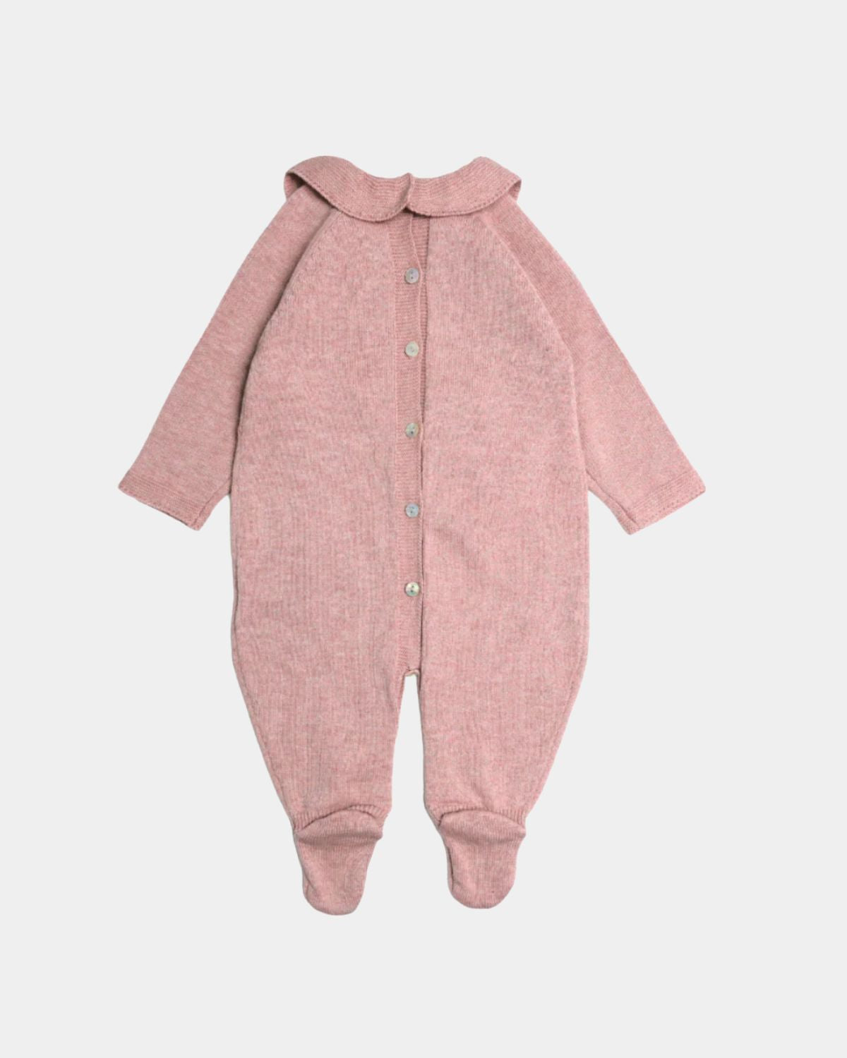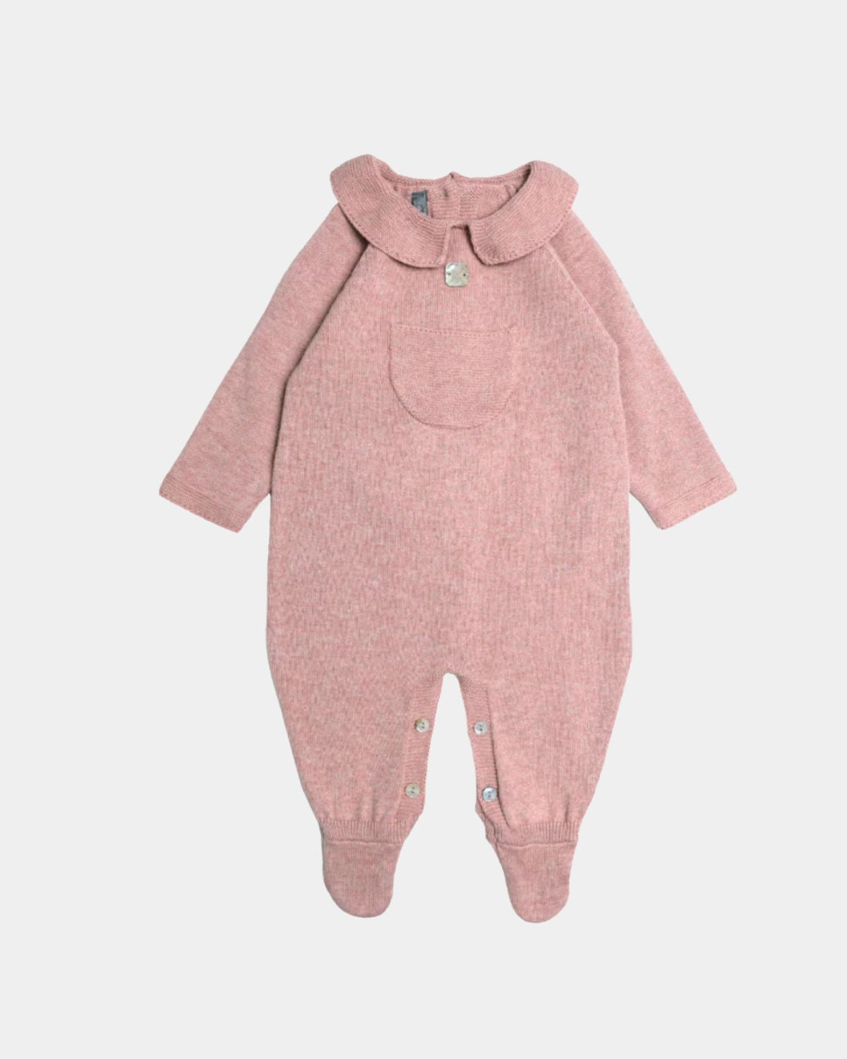 Pelele de manga larga de color rosa palo, con cuello bobo y bolsillo delantero. Para bebé de 1 a 12 meses. Cierre con botones de nácar por el centro de la espalda y a lo largo de las perneras, para facilitar la puesta de la prenda y el cambio de pañal. Prenda 100% de algodón.
