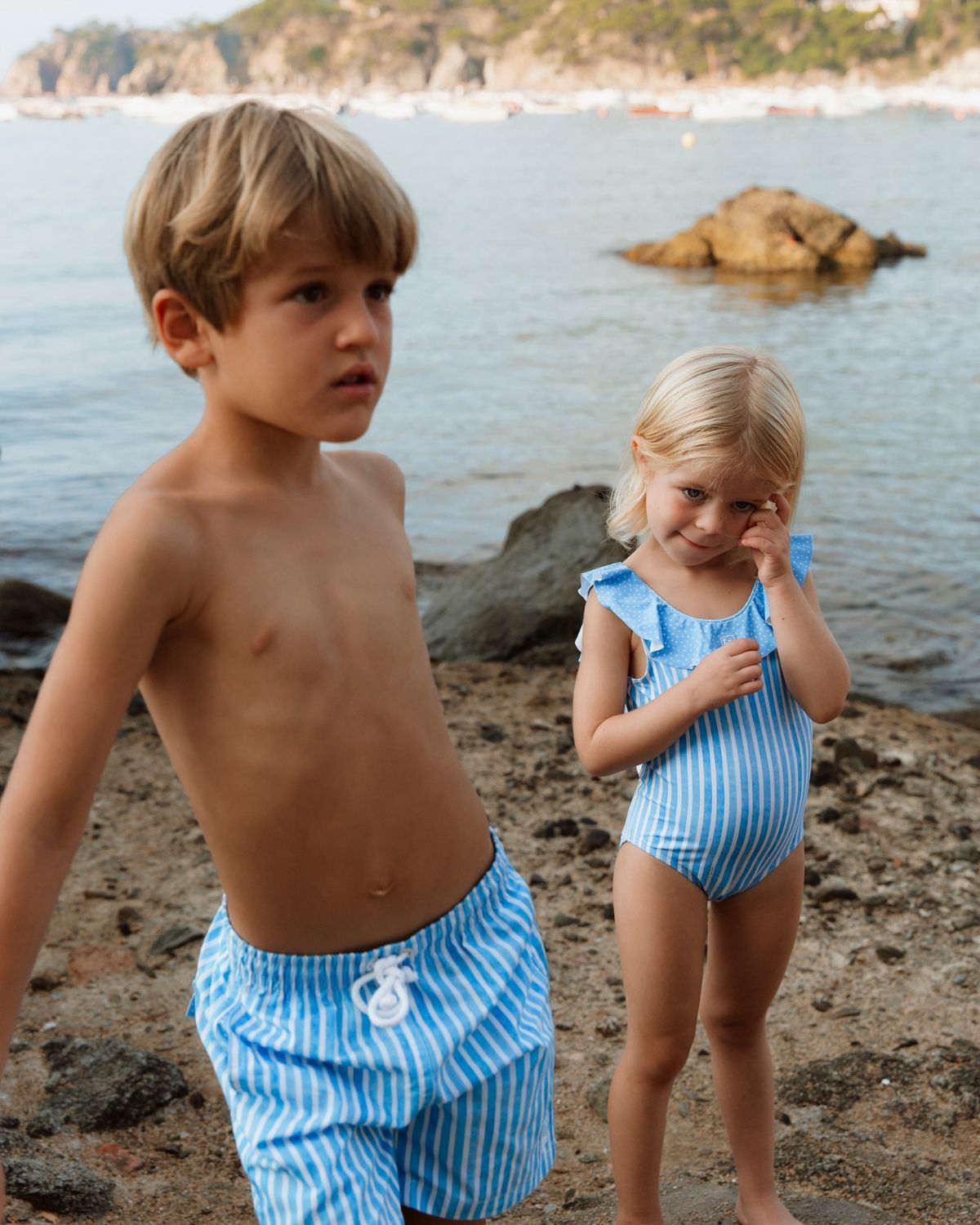 Este bóxer de baño de la Serie Rayas tiene unos bolsillos laterales y un bolsillo trasero decorativo. Su forro interior lleva unos agujeros suficientemente pequeños, como para evitar problemas con las partes intimas del peque. Además de la goma elástica, lleva un cordón para asegurar la sujeción en la cintura. Está confeccionado en poliéster 100% y con estampado Estrellas en tonalidades azules.