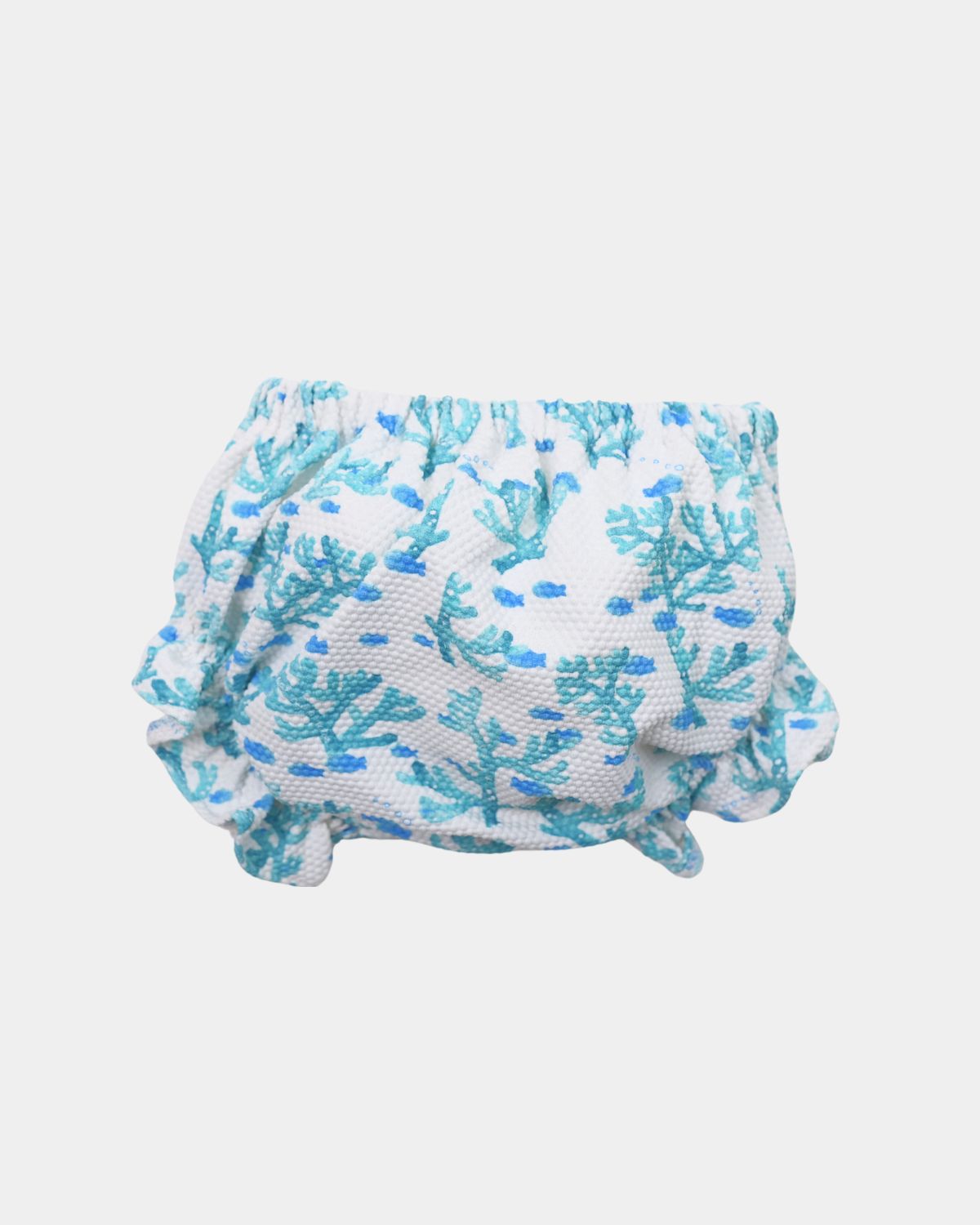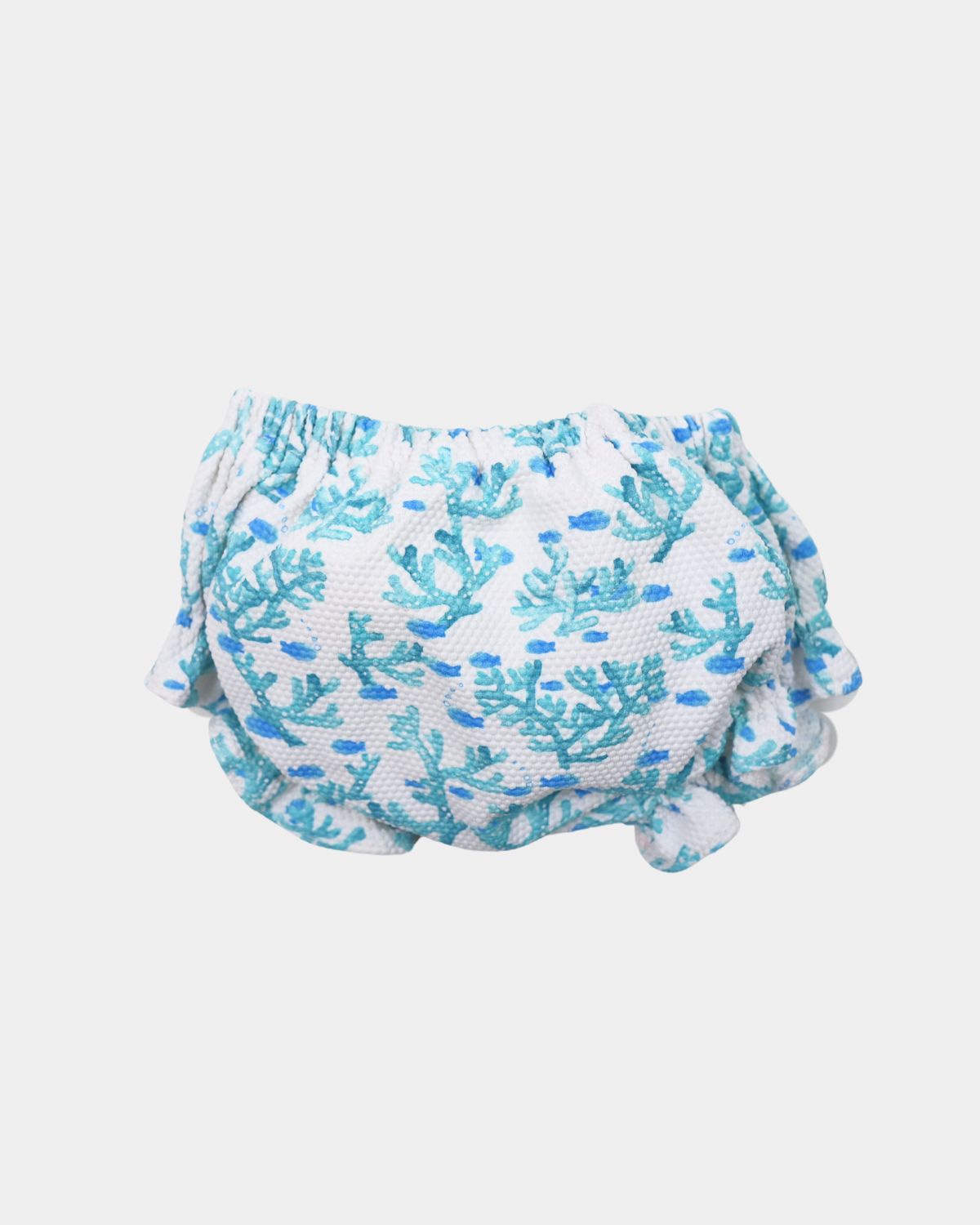 Cubre pañal de baño confeccionado en tejido de poliamida con un 18% de lycra y con el estampado Silvia. Las gomas de los camales son extremadamente elásticas y suaves. Es adecuado para colocar sobre el pañal, pero también queda muy mona sin el. Recomendamos quitar el pañal para bañar al bebe y volver a colocárselo después. Esta prenda es adecuada para la playa, pero puede servir perfectamente para vestir en otras ocasiones.