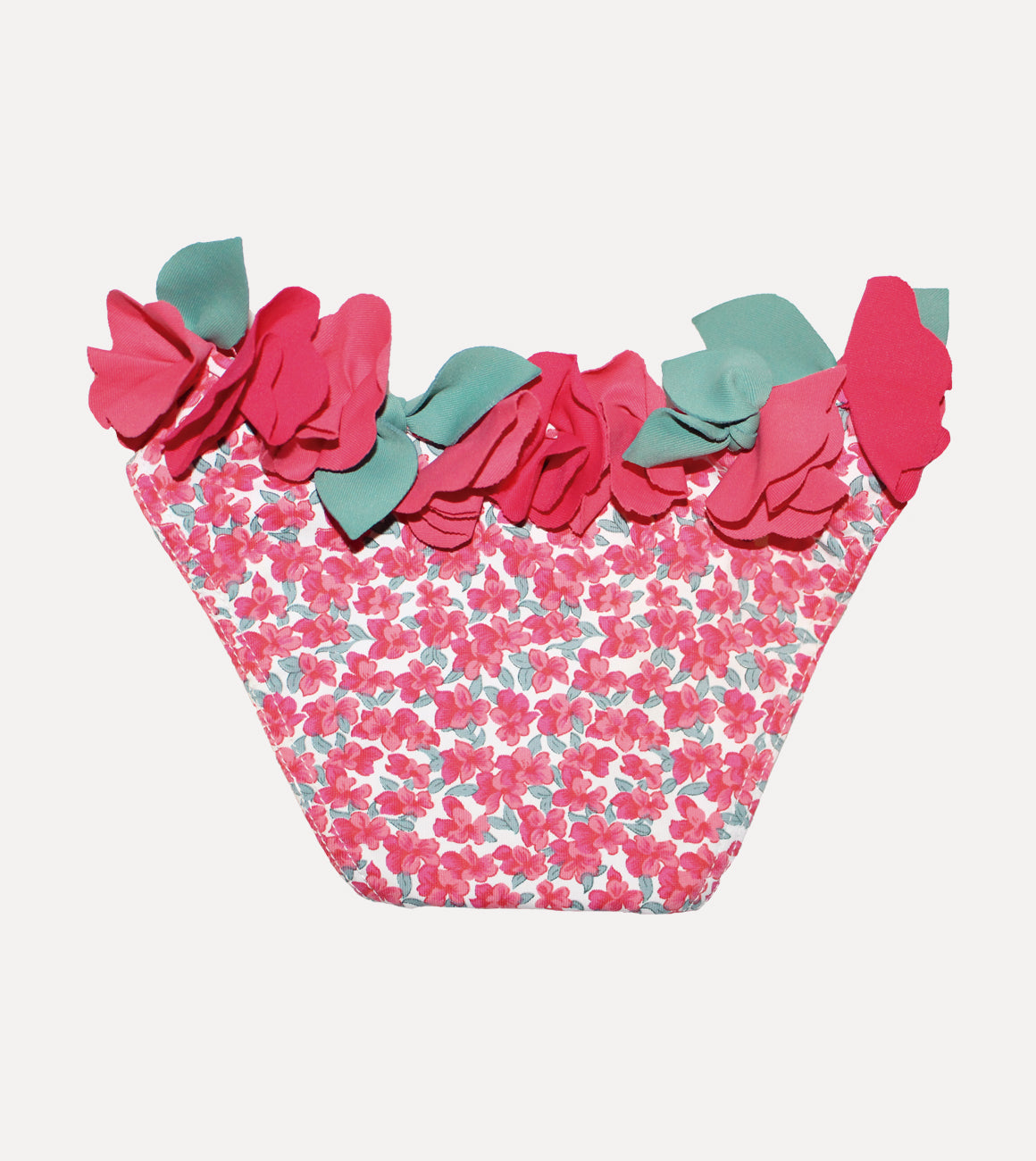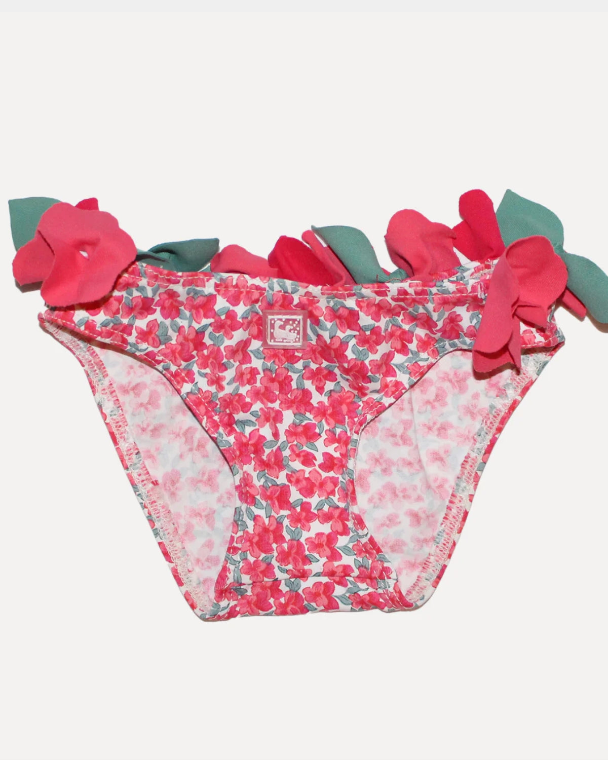 Braguita de baño estampada y confeccionada en tejido de poliamida con un 18% de licra. En los laterales y en la parte trasera tiene florecitas cosidas a conjunto del estampado, que le dan un toque especial.