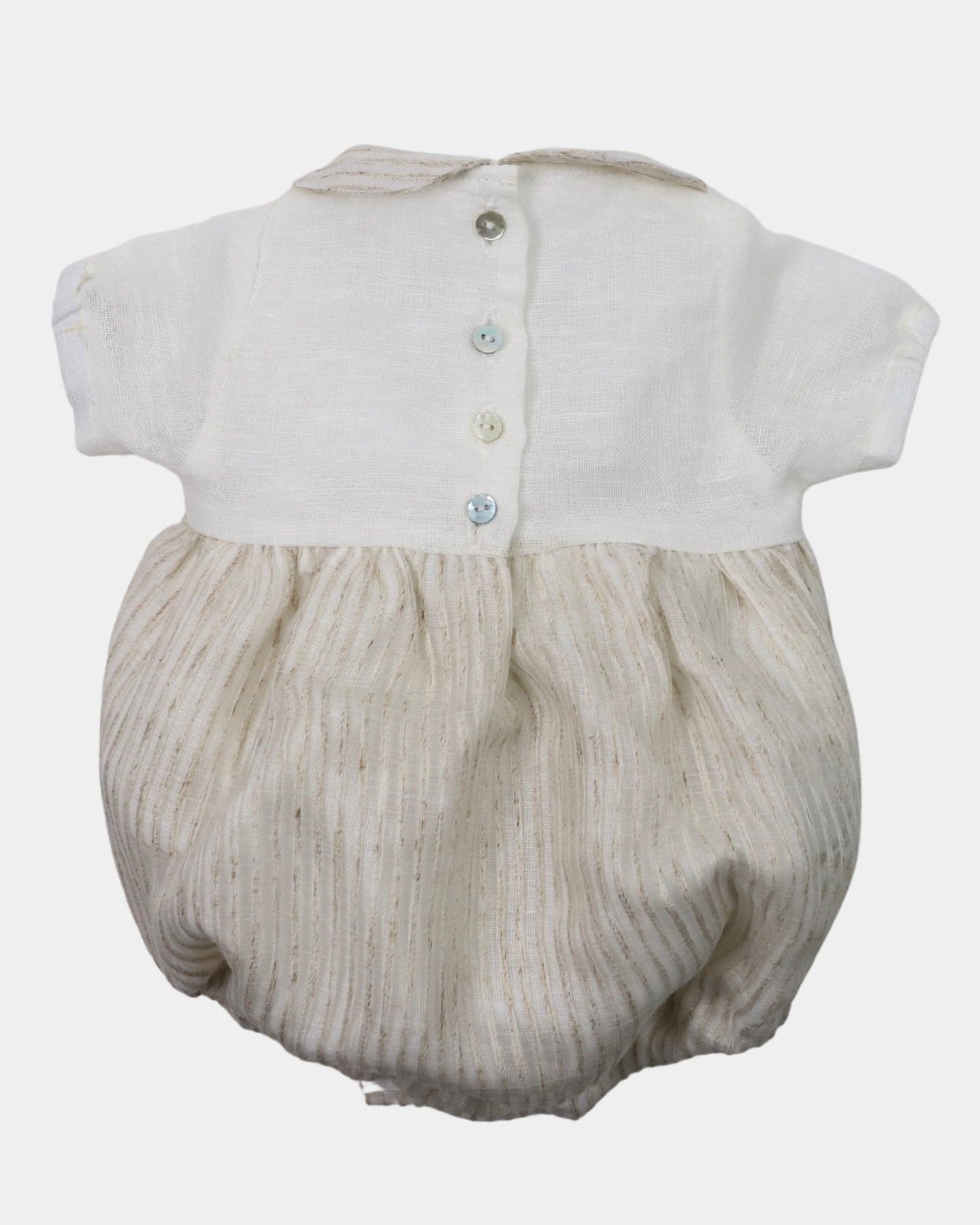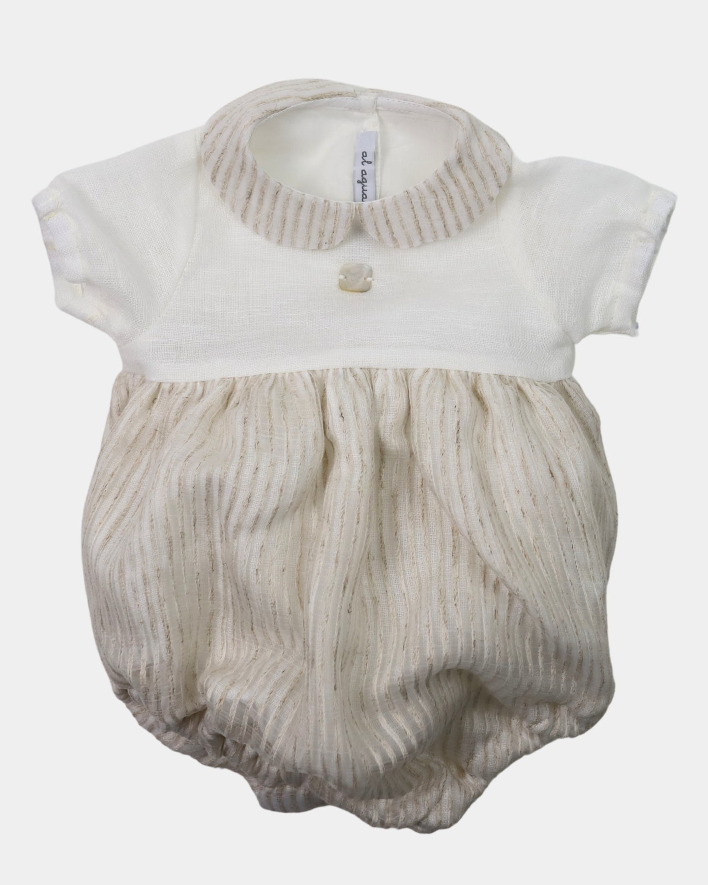 Esta prenda de la serie Trigo, es especialmente para bebes debido a su apertura en la entrepierna, con automáticos. La parte superior con tejido en punto liso y se puede abrochar por la espalda. La parte inferior está compuesta con un estampado en tonos crudos.