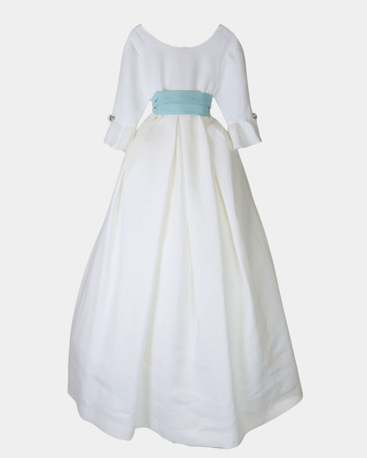 Vestido de lino con flores en las mangas. Está hecho de lino y tiene un color blanco roto. Lleva el forro y kankan de polyester. (Este precio incluye cualquier tipo de mangas y kankan, pero NO INCLUYE FAJIN).