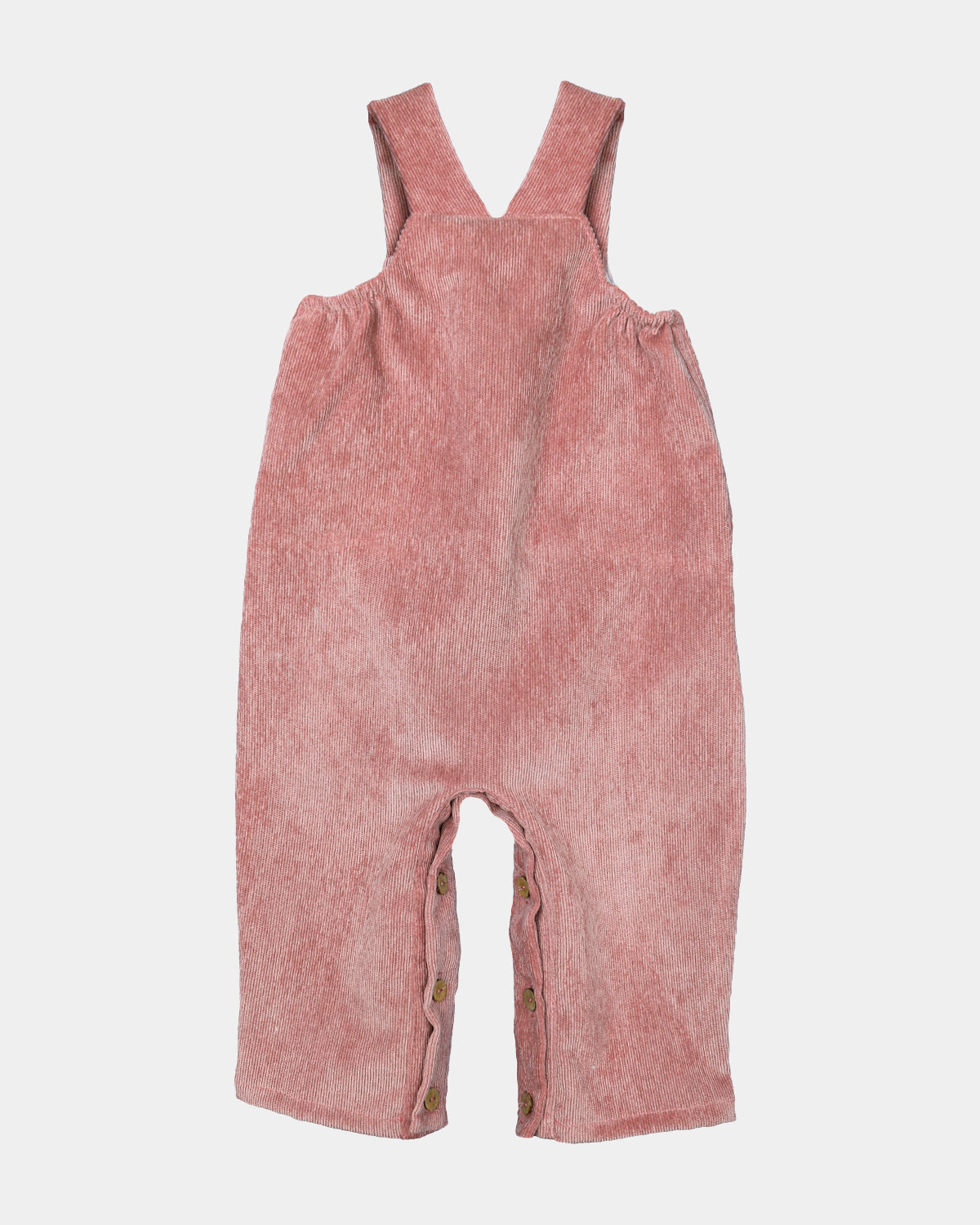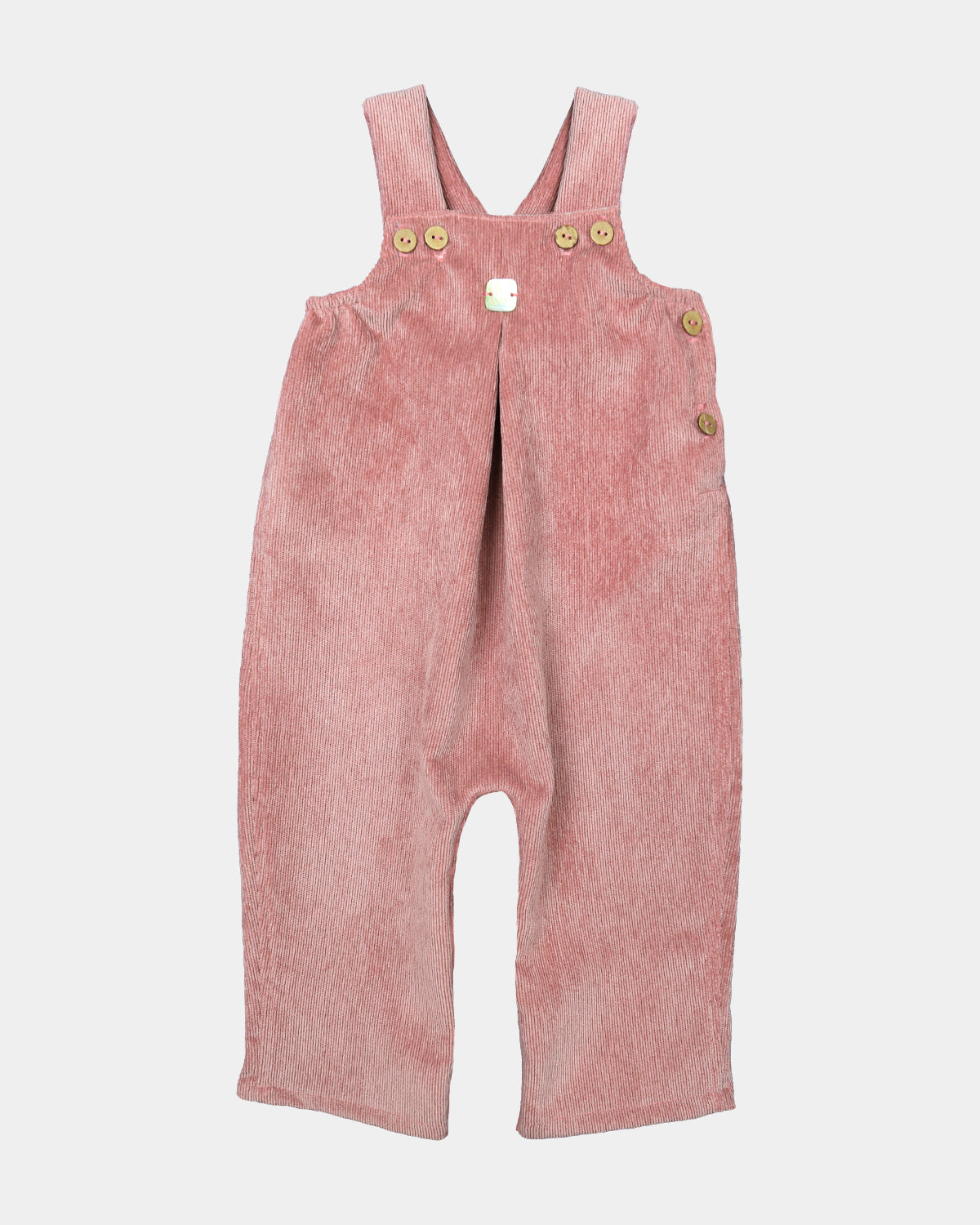 Pololo teja de pana, se abre con botones de madera por delante en ambos lados, por el lateral y a lo largo de las perneras para facilitar la puesta de la prenda y el cambio de pañal. Para bebés y niños de 1 mes a 3 años.