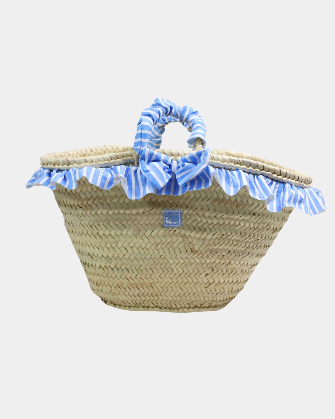 Este cesto de palma es el complemento perfecto para las mamás. Mide 20x44x12 cm. El tejido de la colección Rayas es el que confecciona el volante que rodea todo el cesto junto con las asas. Debajo de estas lleva un lacito con el mismo estampado.