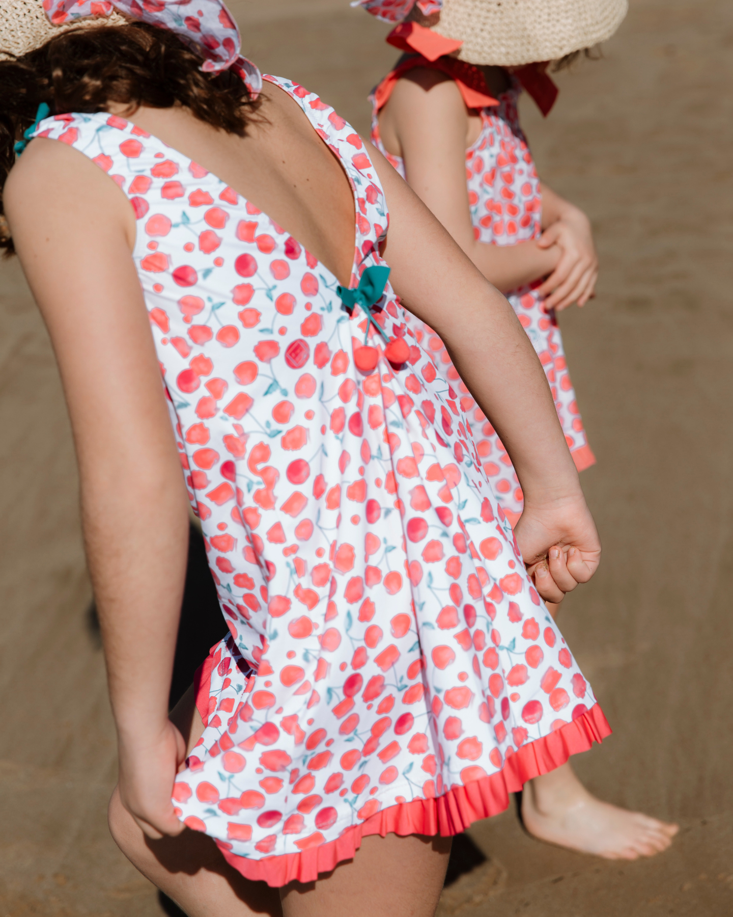 Este vestido del estampado Cerezas está confeccionado en tejido de poliamida con un 18% de lycra, esto puede parecer absurdo por que no sirve para bañarse, pero tiene la ventaja de que no se arruga, es cómodo, y al final del verano sus colores están como el primer día. En los hombros y en la parte posterior, los detalles además de anudados van cosidos para evitar que se pierdan. En el pecho lleva bordado el anagrama de nuestra marca : una familia de patitos. Esta es una de nuestras prendas estrella, quien lo prueba repite!