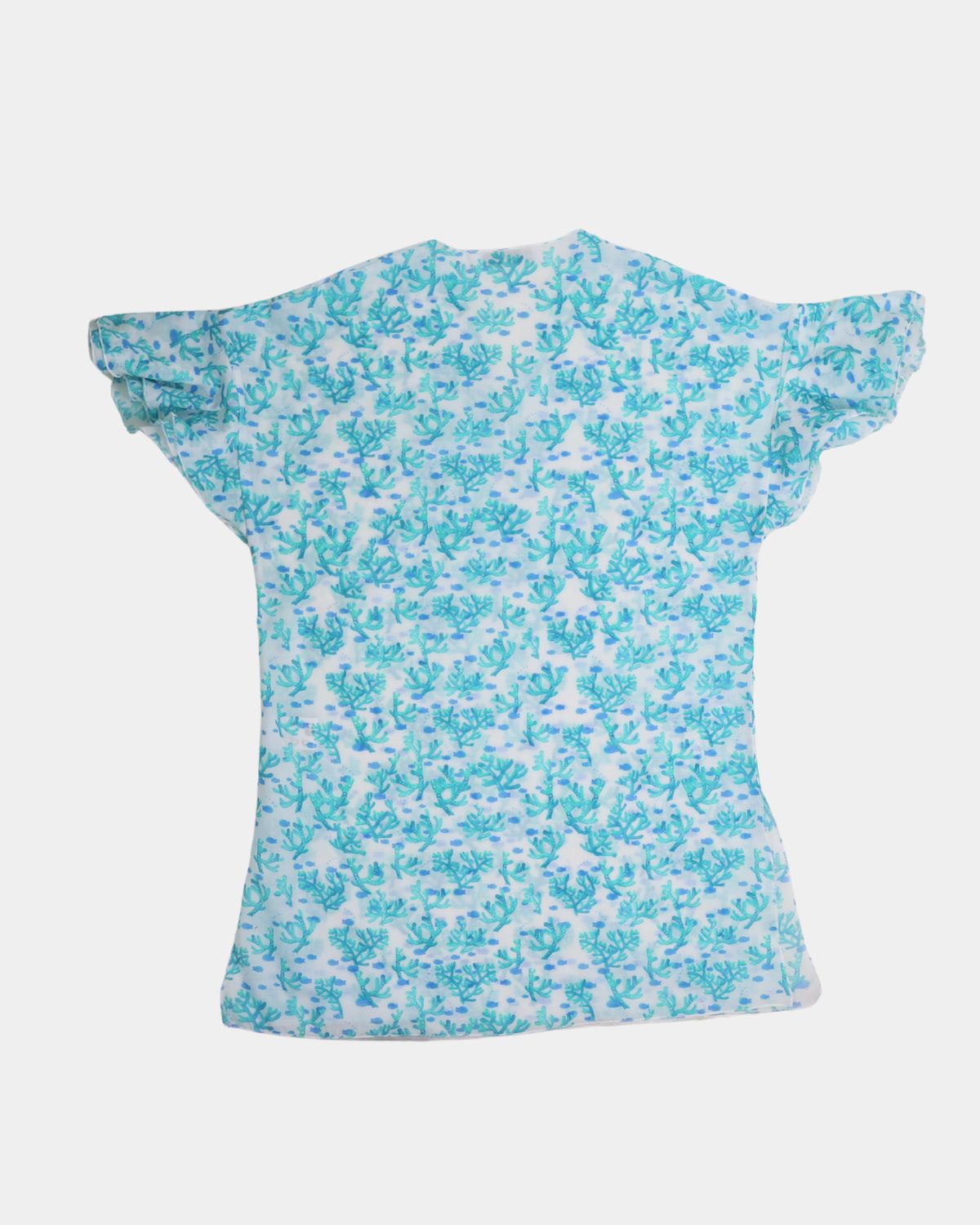Esta ligerísima túnica, esta confeccionada con el estampado de la serie Coral. Queda genial combinado con el bikini o el bañador de la misma serie. Su escote permite que sea fácil de poner y quitar y los volantes de las mangas le dan un toque único. Este caftán está confeccionado en fino voile, de algodón 100%.