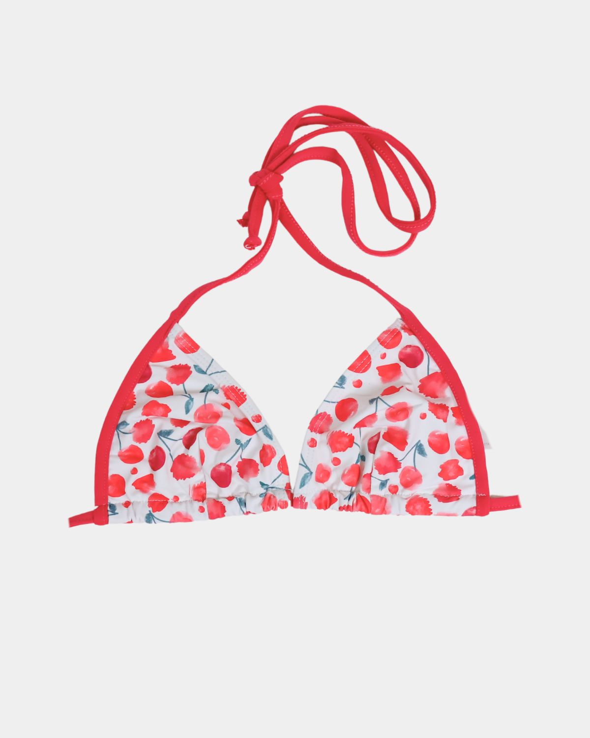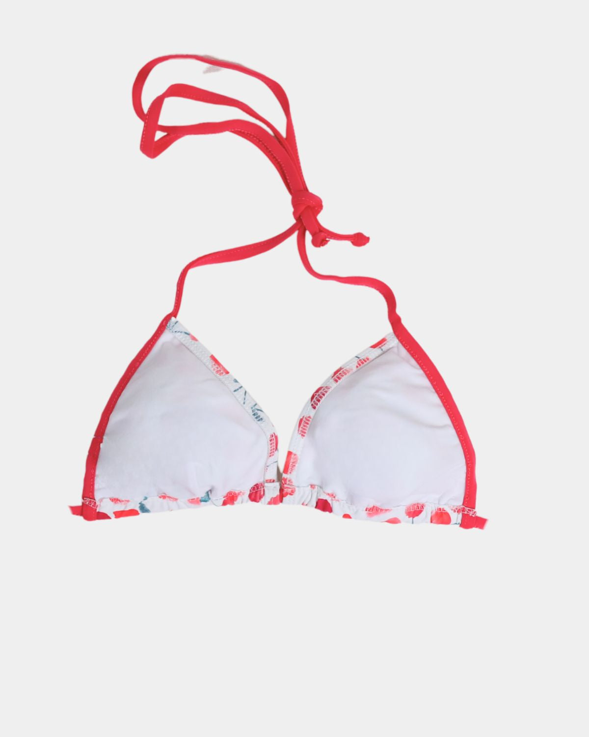 El biquini Cerezas para mamá favorece muchísimo a las más bronceadas y queda genial con el caftán o el pareo de la misma serie para ir a la playa. La forma de triangulo de su top permite regular la forma, ensanchando o comprimiendo la base para que se ajuste a todas las formas del pecho. El tirante no va al cuello, si no que va sujeto al tirante de la espalda, para evitar molestias en las cervicales. Una vez ajustados los tirantes y las copas el bikini resulta muy favorecedor, ideal para coordinar con los bañadores de toda la familia.