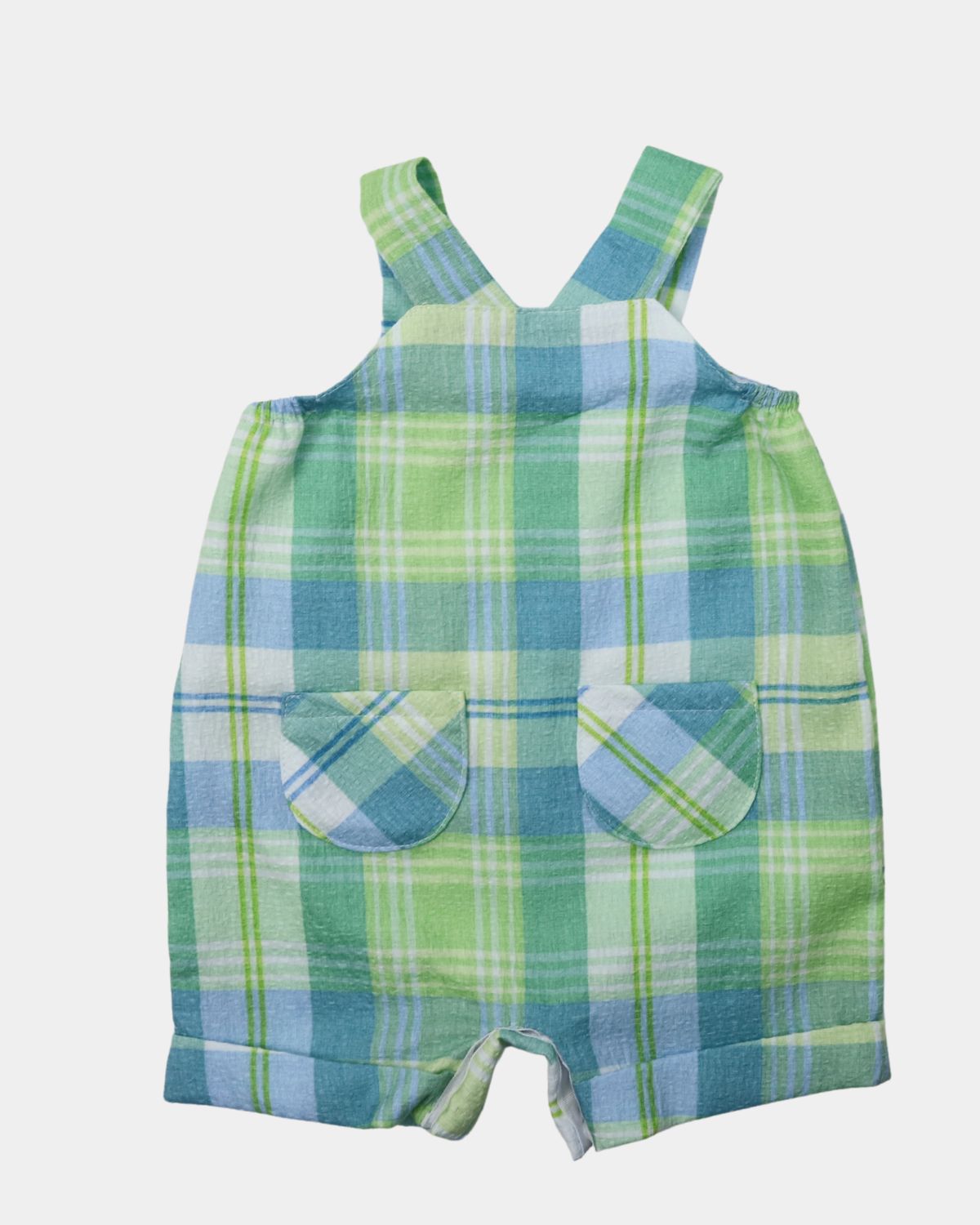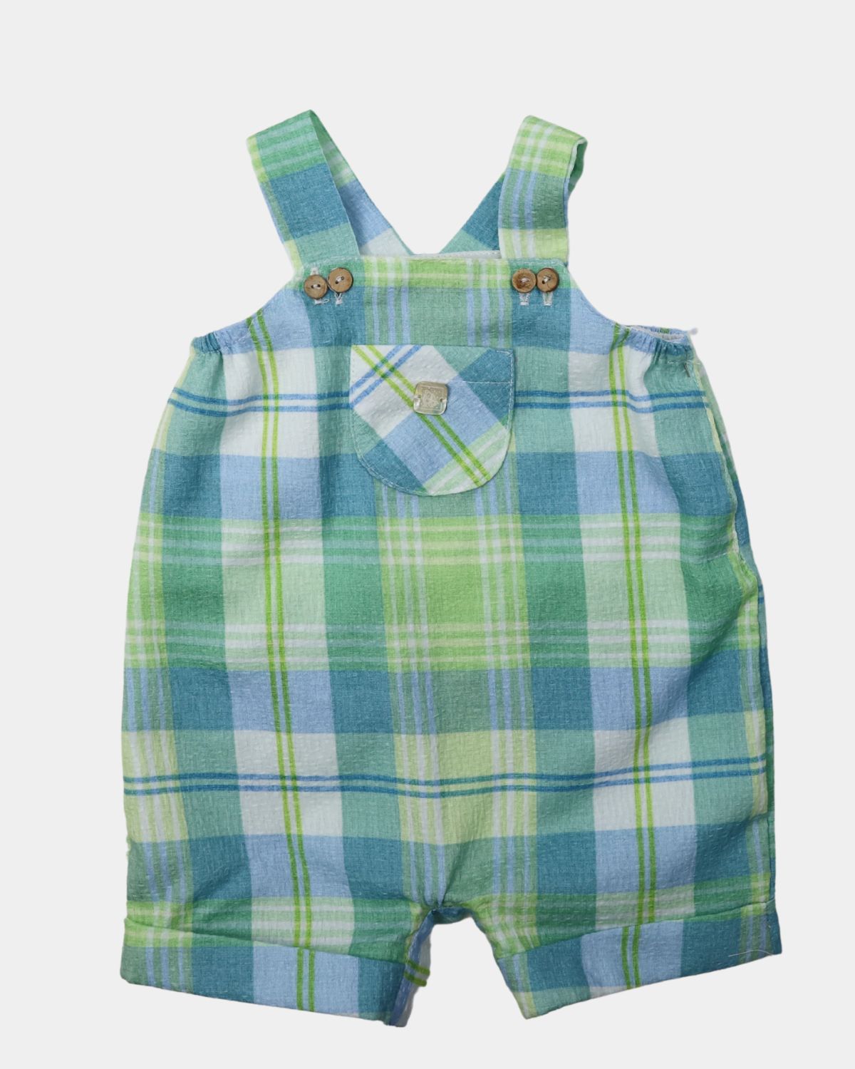 Este pelele de la serie Comporrta, en tonos verdes y azules. Es ideal para bebes debido a su apertura en la entrepierna, con automáticos. Los botones de los tirantes son fijos. En la pechera lleva bordado nuestro anagrama formado por una familia de patos.