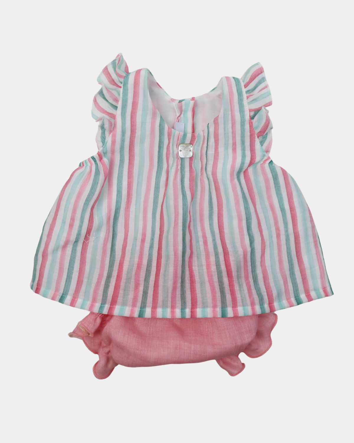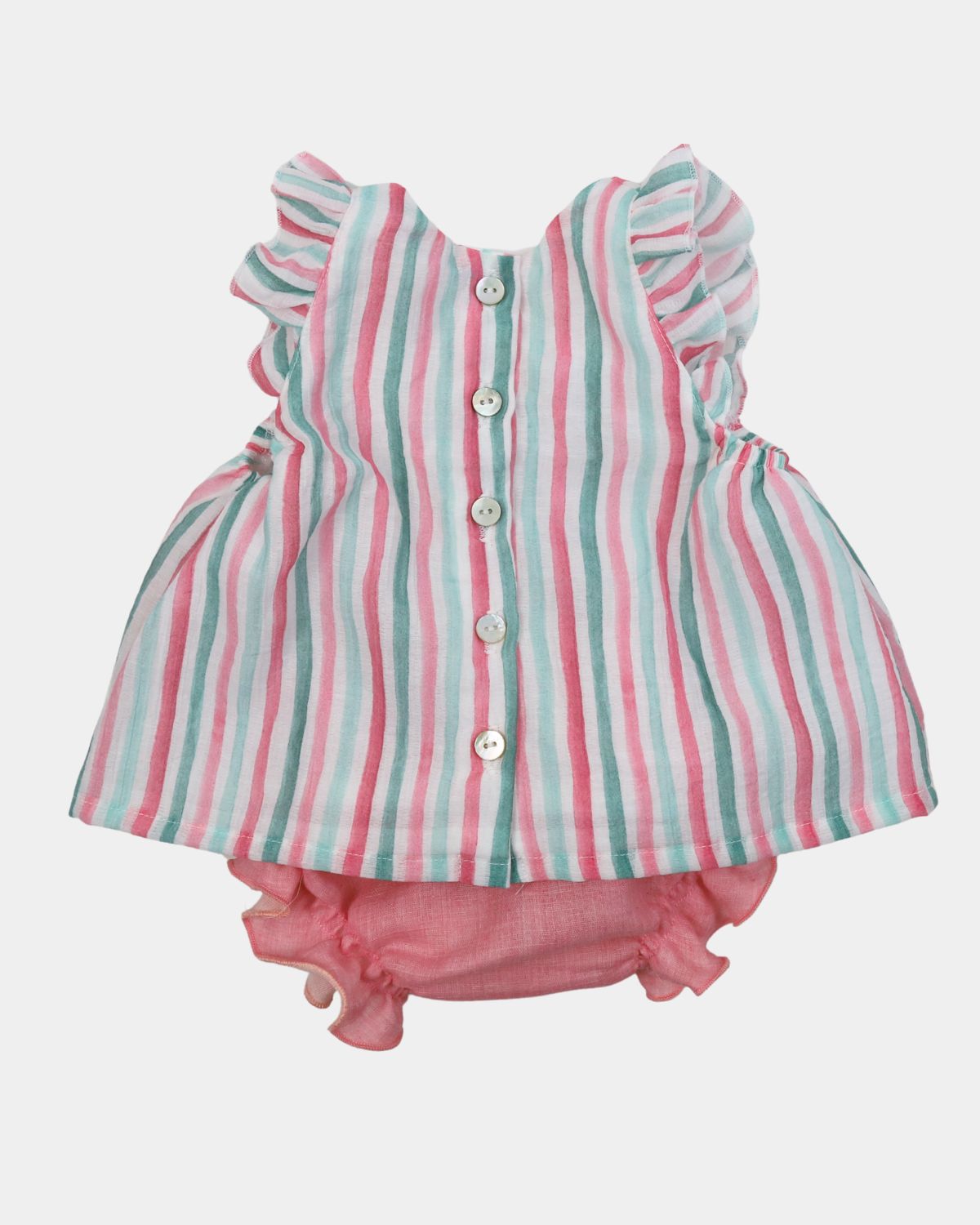 Conjunto compuesto por un vestido y un cubre pañal en el estampado Faro. El vestidito tiene un amplio escote en la espalda que permite su fácil colocación. El lacito, además de anudado está cosido para evitar que se pierda. La braguita lleva unas gomas en los camales extremadamente elásticas y suaves. Es adecuada para colocar sobre el pañal, pero también queda muy mona sin el. En la pechera lleva bordado nuestro anagrama formado por una familia de patos.