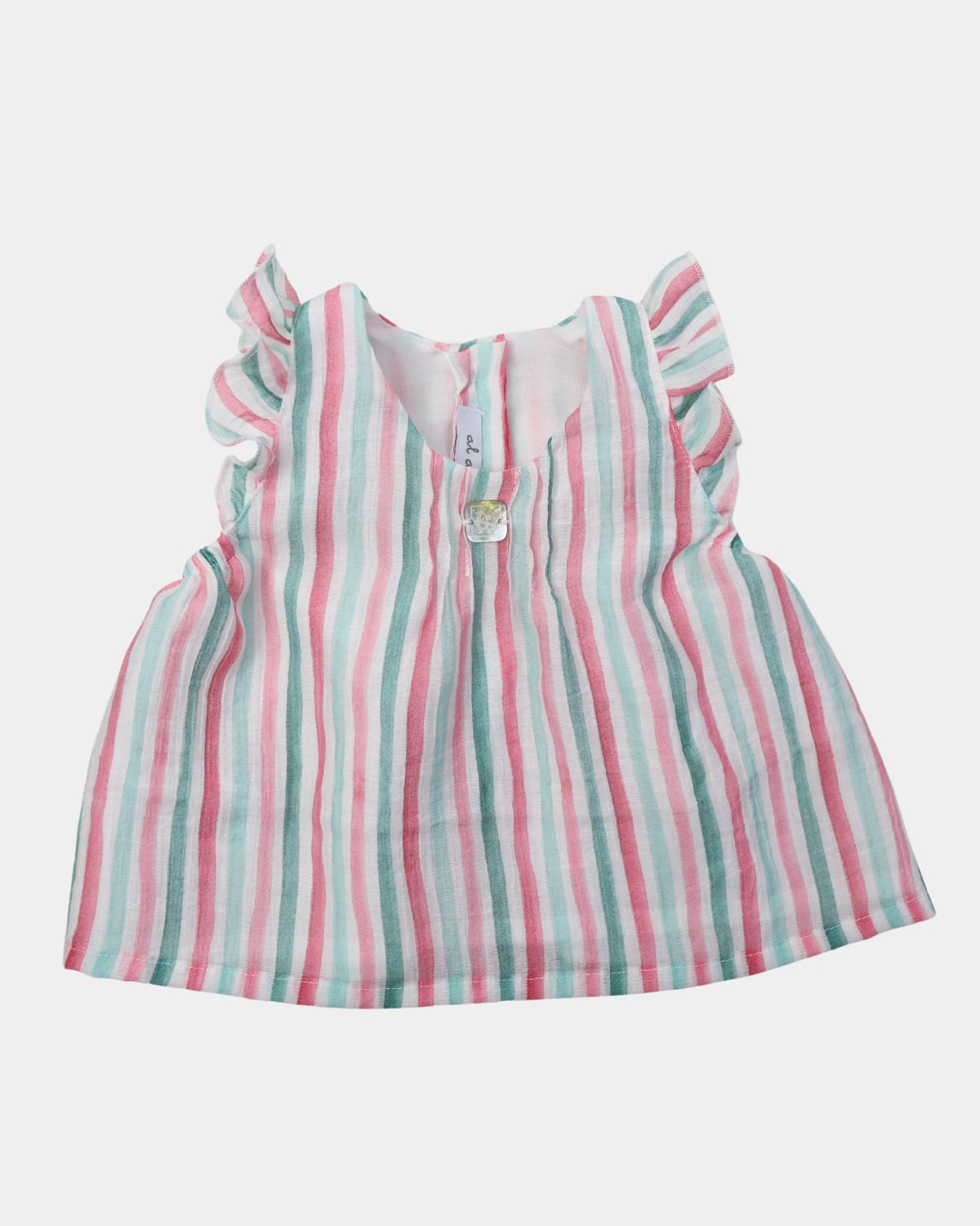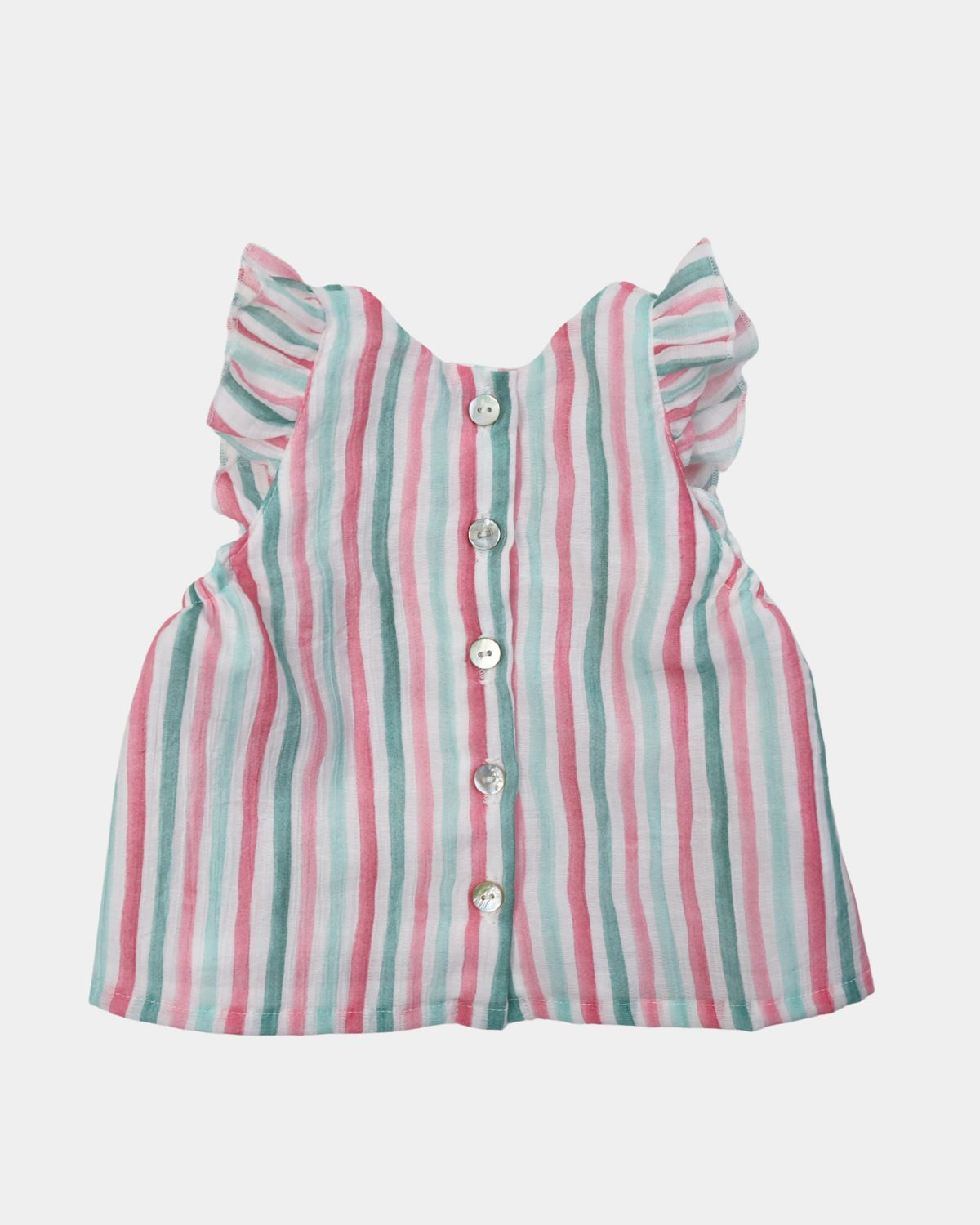 Esta blusa está pensada para las niñas más mayores. En los hombros lleva unos volantitos y se abrocha por delante con unos pequeños botones de nácar. 100% algodón.