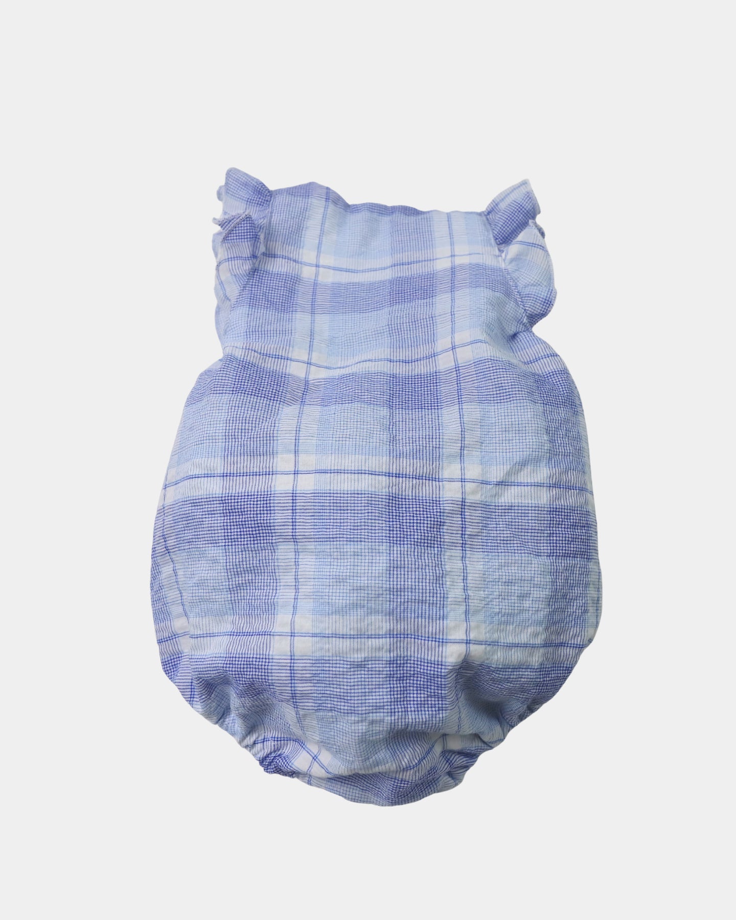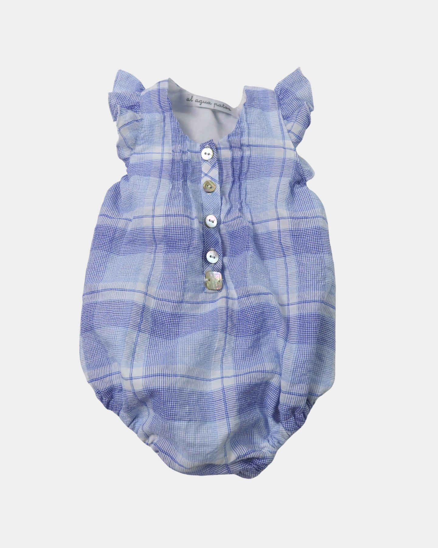 Ranita en tonos azules y blancos de tirantes para bebé recién nacido a 24 meses y confeccionado con la tela de la serie Brisa. Se abrocha con unos botoncitos de nácar en el pecho y automáticos en la entrepierna para que cambiar el pañal sea mucho más fácil. Lleva unas gomas muy suaves en los camales que no aprietan.