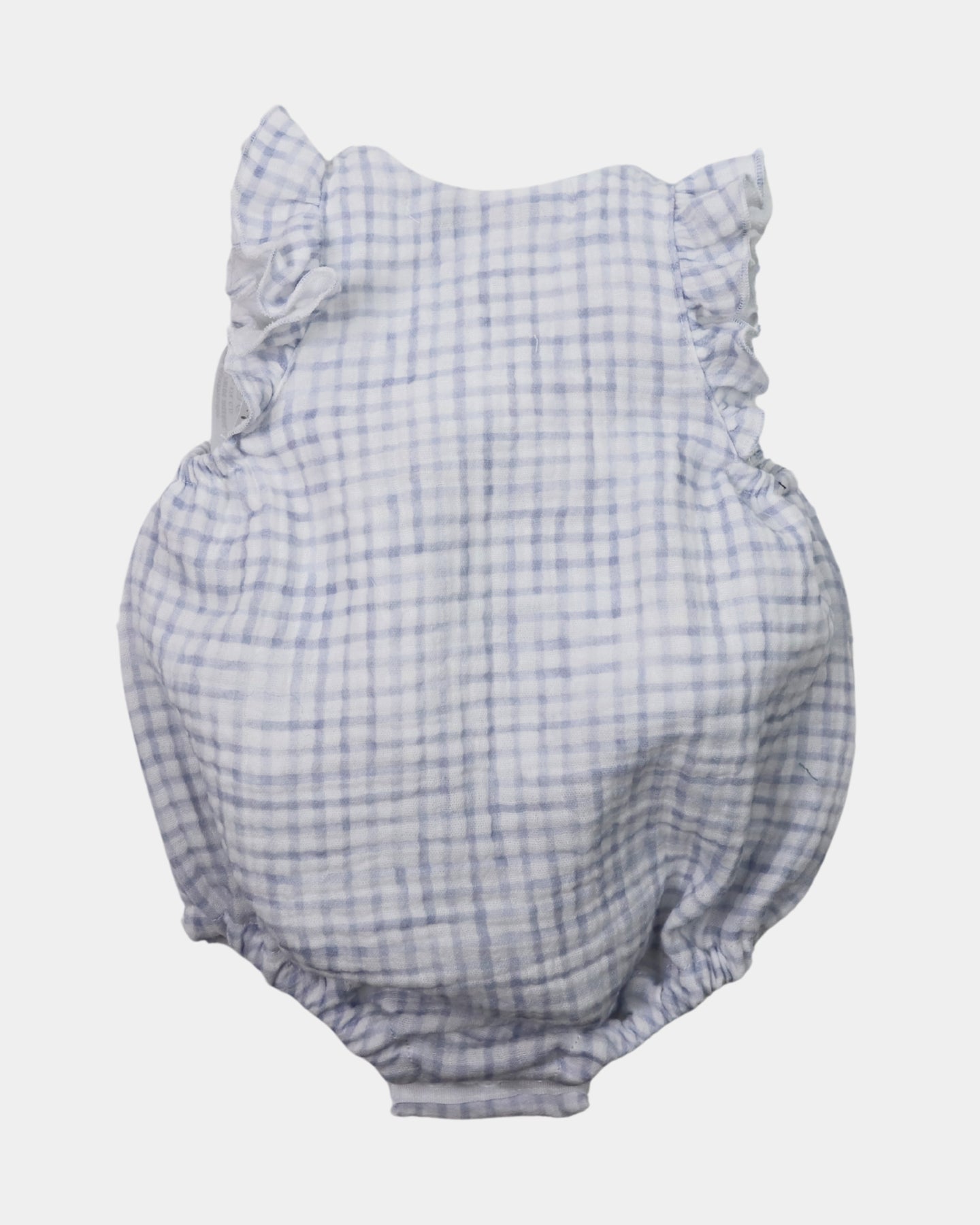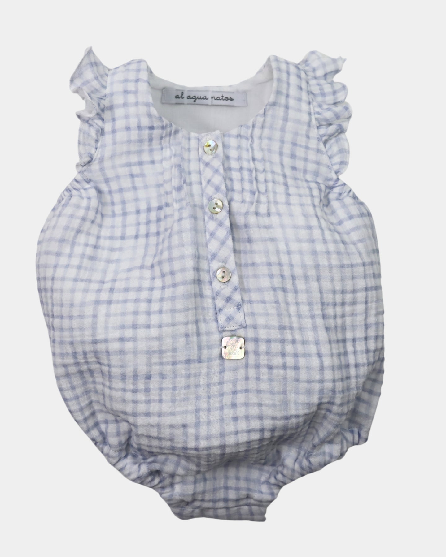 Ranita en tonos azules y blancos de tirantes para bebé recién nacido de 1 a 24 meses y confeccionado con la tela de la línea Capri. Se abrocha con unos botoncitos de nácar en el pecho y automáticos en la entrepierna para que cambiar el pañal sea mucho más fácil. Lleva unas gomas muy suaves en los camales que no aprietan.