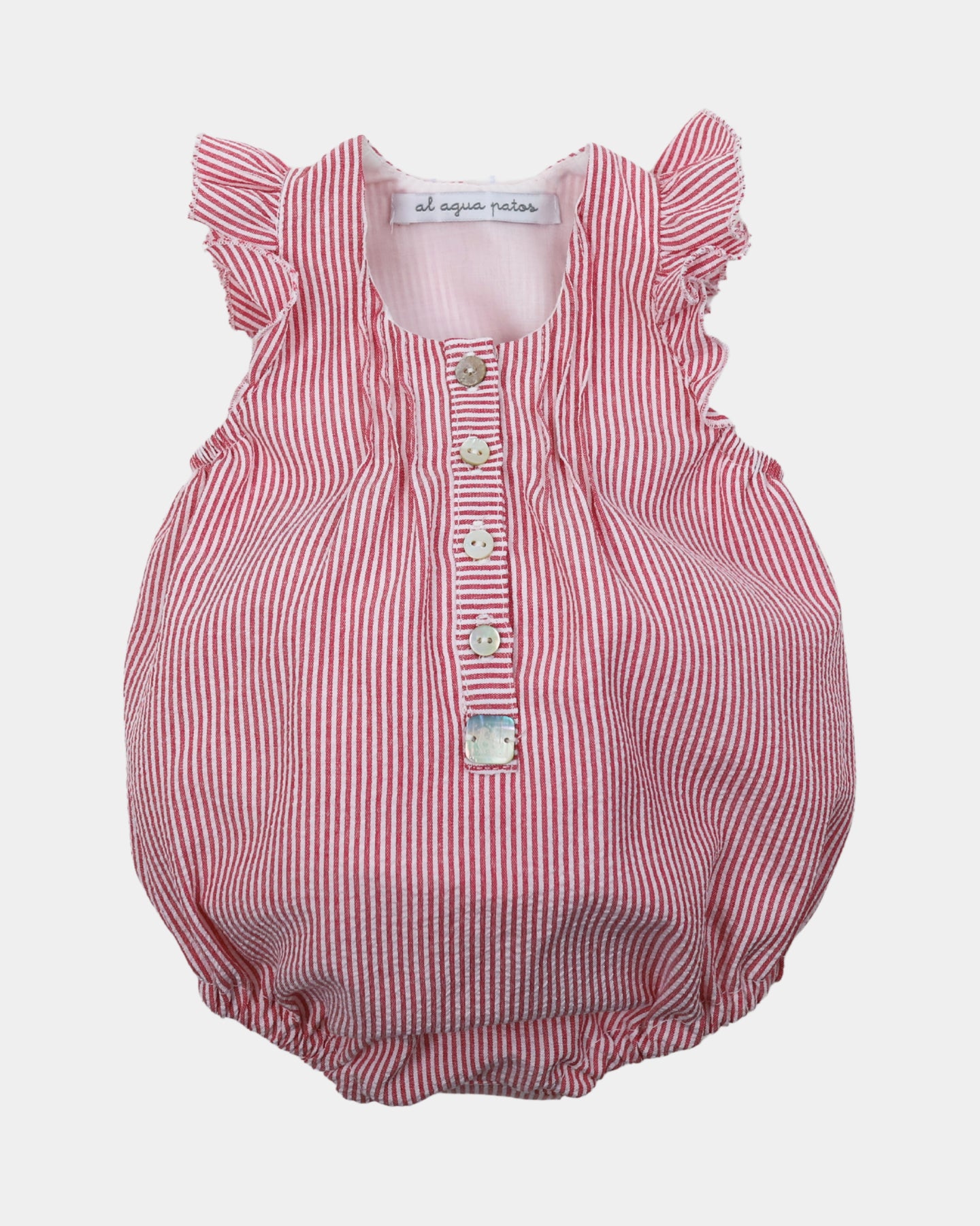 Ranita en tonos rojos de tirantes para bebé recién nacido de 1 a 24 meses y confeccionado con la tela de la serie Rosso. Se abrocha con unos botoncitos de nácar en el pecho y automáticos en la entrepierna para que cambiar el pañal sea mucho más fácil. Lleva unas gomas muy suaves en los camales que no aprietan.