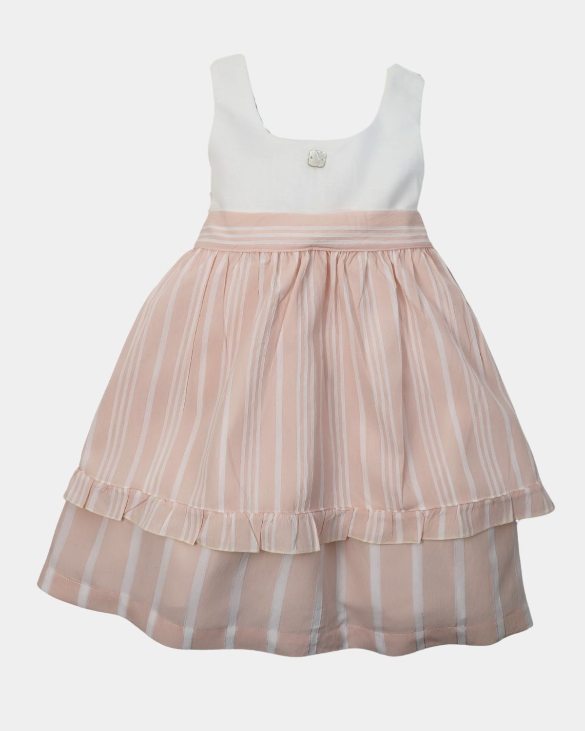 Vestido de niña perfecto para las ocasiones especiales. La falda tiene mucho vuelo y en los laterales y en la espalda el tejido engomado hace que se ajuste a la perfección al cuerpo de las niñas. Diseñado con una falda que se ata en la parte trasera. Los tirantes tienen el tejido ligeramente fruncido y se juntan en la espalda haciendo una forma de V.
