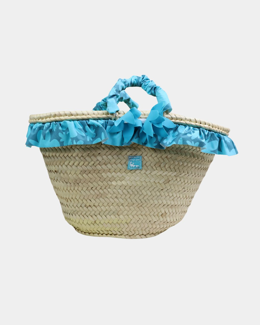 Este cesto de palma es el complemento perfecto para las mamás. Mide 20x44x12 cm. El estampado de la Serie Hibiscus es el que confecciona el volante que rodea todo el cesto junto con las asas. Debajo de las asas lleva unas florecitas.