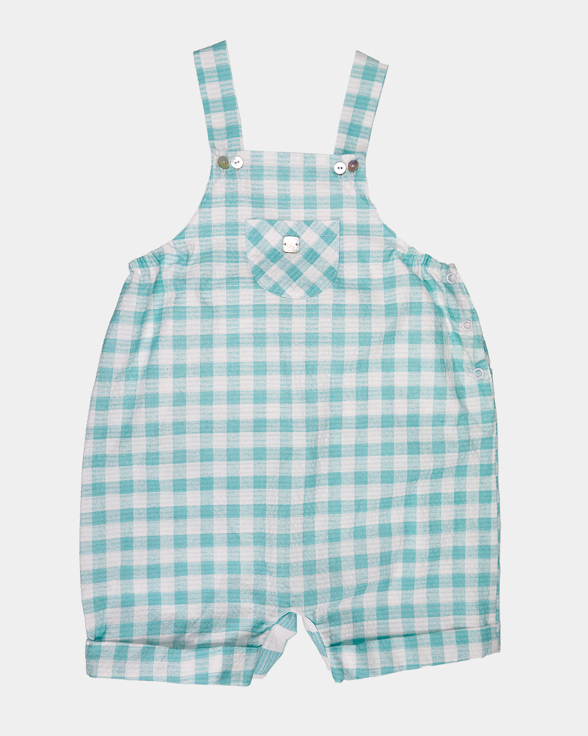 Este pelele de la serie Brisa, en tonos azules. Es ideal para bebes debido a su apertura en la entrepierna, con automáticos. Los botones de los tirantes son fijos. En la pechera lleva bordado nuestro anagrama formado por una familia de patos.